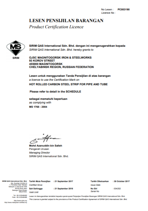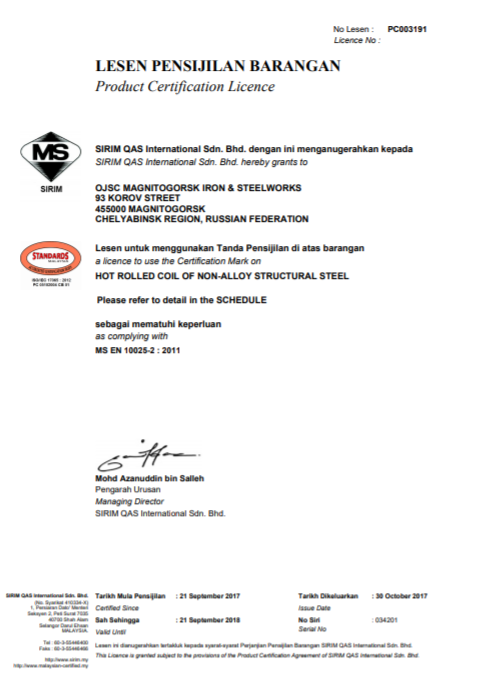 Сталь ММК сертифицирована международной лабораторией Sirim Qas International.